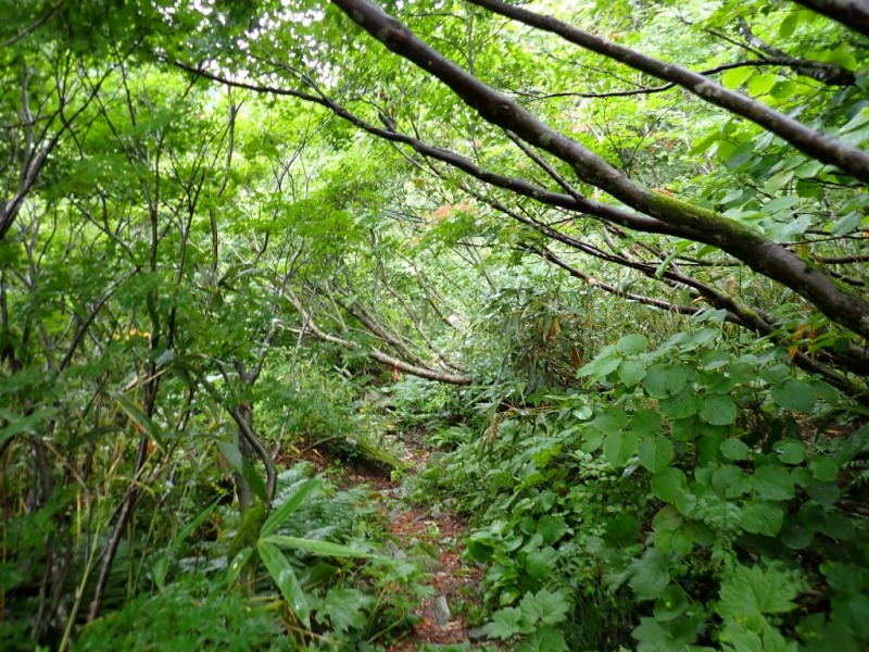 ・登山道は、所々に目印のテープもあり迷うことはなかったが、藪で足元が見えない箇所、岩に苔がついている箇所、水路と化している箇所があった。前日からの雨の中で、滑りやすく十分な注意が必要だった。実際、私も何度か滑って転んだ。