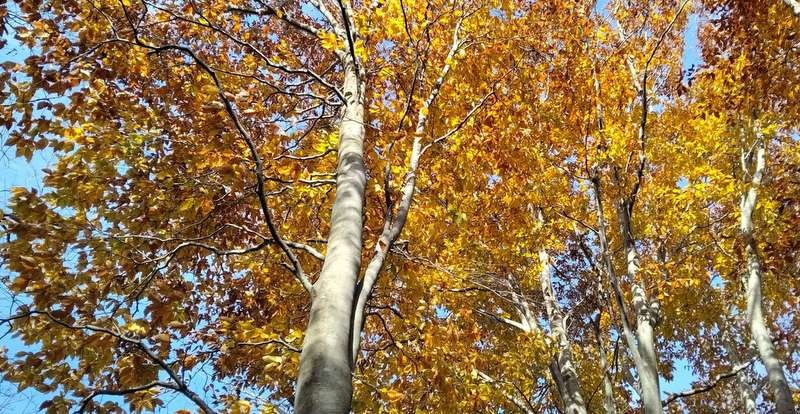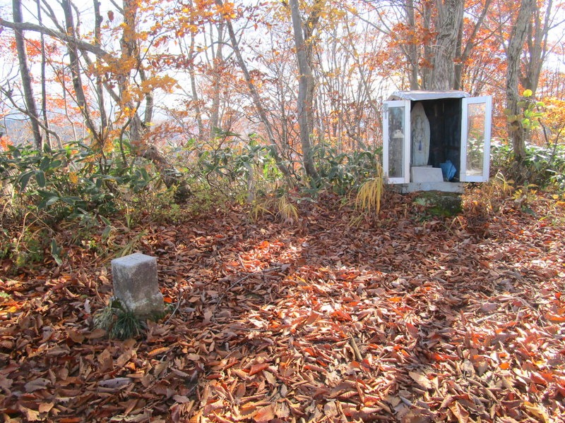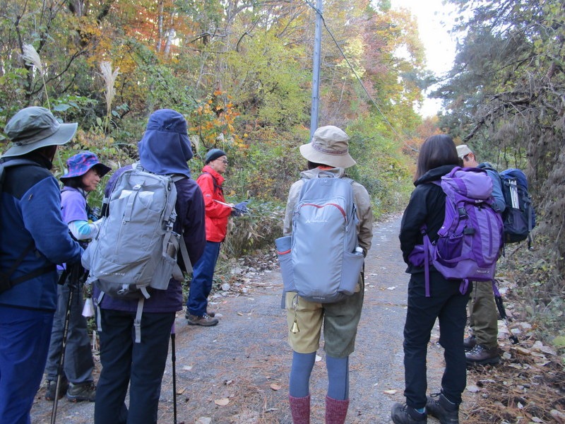 中での遭遇も怖い中、複数人で行動できる会の山行はとても心強く思いました。登山口で熊撃退スプレーを試射されましたが期限切れとはいえ強力な刺激で、私を含め近くにいた数名の方がカプサイシンを浴びてしまい、目鼻喉を強力にやられ咳き込んだり涙流したり、登山前から大賑わいとなってしまいました。ベアホーンも大音量で熊も登山者が今から来ることを認識しただろうと思います。晴天に恵まれ紅葉も見頃であり、とても美しく何度も感嘆の言葉が自然と出てきます。ブナ、カエデ、ホオノキなどの落葉を踏み締めながら歩くのはフカフカで、ゆったりと山歩きを楽しめました。先に奥高尾山に行き山頂から金沢市街地、日本海、近くの医王山など眺めることができ、空気が澄んでいたためかとても見晴らしがよかったです。下山時は登山道を多くの落葉のため、その下に潜む苔の石に細心の注意のもとはらはらしながらおりました。下山途中に前高尾に寄り、観音様を納めた堂があり、晩秋の山を満喫することができることを感謝しました。(Y・S)