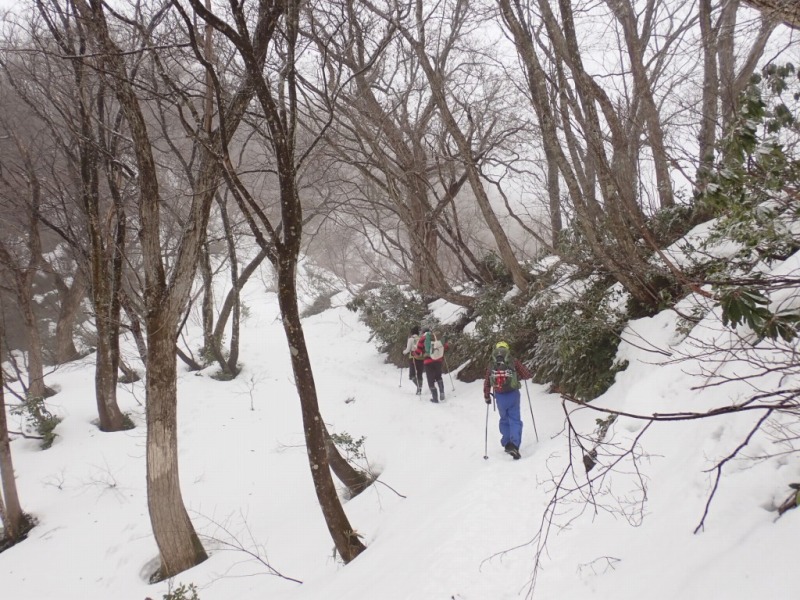 ・私には初めて登る山。曇り空で剱岳や毛勝三山などの展望はできませんでしたが、雪上のトレースがありかんじきは不要。4人でワイワイ言いながら多いに楽しめました。(T・O)