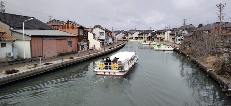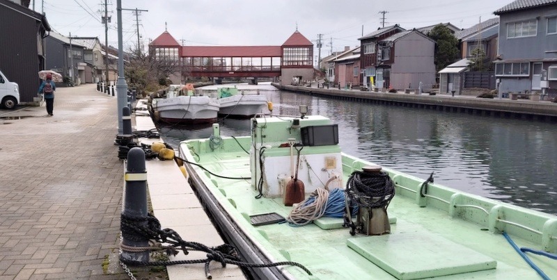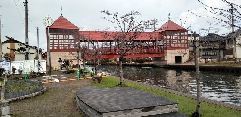 ・朝から雪が舞って寒い一日でした。新湊大橋の「あいの風プロムナード」をゆっくり歩く。上を車が走っているので少し揺れてる…。 昇降用エレベーターで降りて堀岡発着場から県営渡船に乗り、越の潟発着場にあっという間に着いちゃいました。希望者で内川に車で移動。お昼まで時間があったので周辺を散策。レトロな東橋を見て「川の駅
