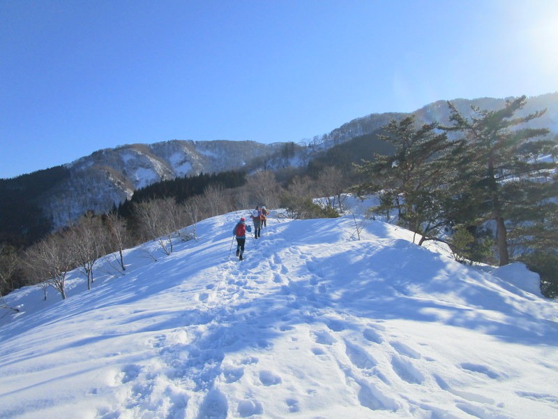 ・初参加のため、皆様に付いていけるか不安だった。雪の踏み跡が凍っていたため、登山靴にアイゼンを付け、足首を支えて登った。歩き慣れた頃には心地よくなり、いつしかリーダーや、メンバーの勢いに刺激されていた。頂上では、青空、無風、気温15度、周囲の山並みや桜ヶ池を眺めながら昼食。そして、何より雪原のブナの巨木。仁王の様に林立していた。山の主に、改めて敬う思いになった。(S・K)