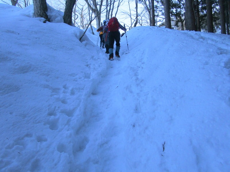 ・今日はラッセルを心配しましたがしっかり道がついていました。登りアイゼン、下りかんじきをつけて登行。寒くも暑くもなく最高の登山日和でした。