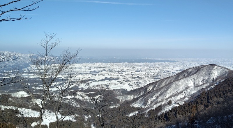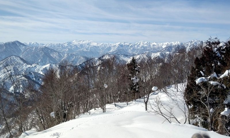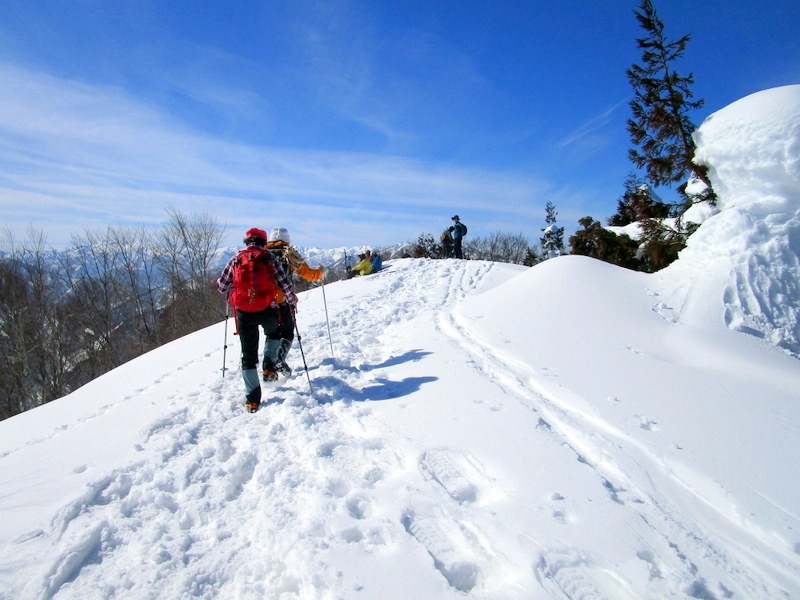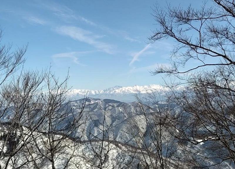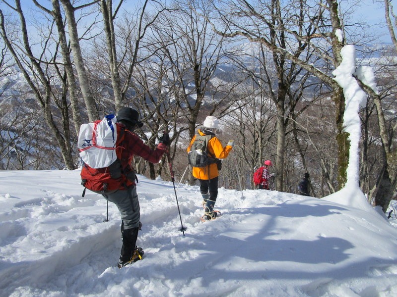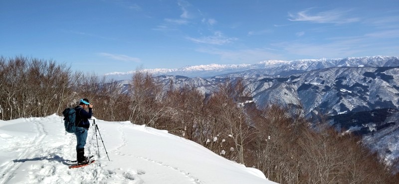 ・好天気が続き、本日も風もなく穏やかな登山日和。私には初めて登る山。登山道にはすでにトレースがあり、各々ピン長ぐつ・チェーンスパイク装着で出発。そこそこの急登もあり、アップダウンを繰り返しながら、ブナ林の大木に励まされ、自分の100%以上の体力と気力で山頂に達成できました。山頂からの展望は、砺波平野、白山山系、北アルプスが一望でき大満足です。下山はカンジキを履いて降りは何とかスムーズに、休憩時にはKさんより春に咲く花マンサクの花芽等の 話を聞き、楽しみながらハイキングする事ができました。今回もメンバーの皆に助けられ、見守られての山行でした。感謝です。ありがとうございました。